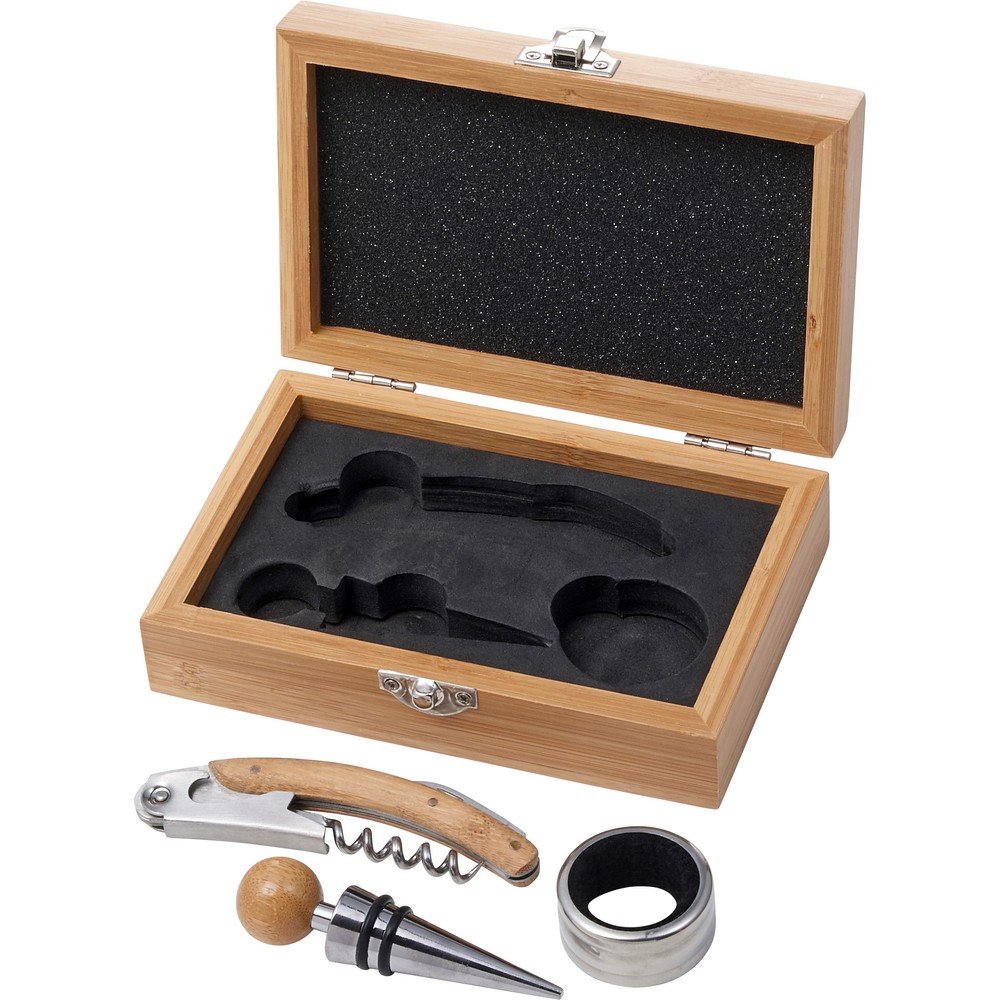 Entdecken Sie das exklusive Weinset in einer stilvollen Bambusbox – Ihr idealer Werbeartikel, um markanten Eindruck zu hinterlassen. Mit seinen eleganten Edelstahl-Akzenten vereint dieses Set funktionale Weinaccessoires: einen Korkenzieher, einen Weingussring und einen Flaschenverschluss. Die hochwertige Verarbeitung aus nachhaltigem Bambus sorgt für eine positive Wahrnehmung Ihrer Marke, während die edlen Materialien die Wertigkeit unterstreichen.
